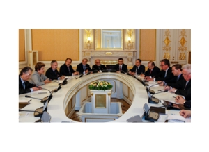 A presidente Dilma em reunião com primeiro-ministro Dimitri Medvedev no Salão Ouro da casa de recepção do governo russo: boa notícia virá do presidente Putin