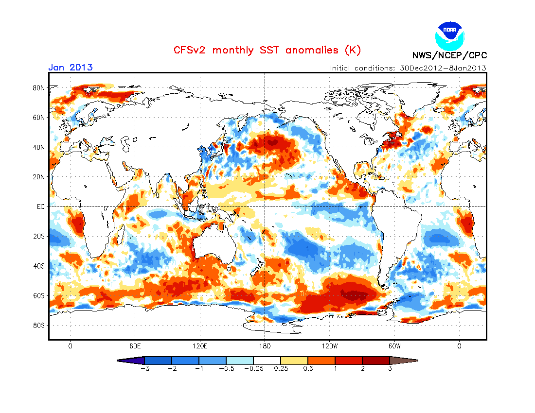 A expectativa é de que a temperatura permaneça mais baixa que o normal até meados de 2013, porém sem amplitude suficiente para a instalação do La Niña (desvios chegando a -0,3°C sobretudo entre fevereiro e março). Depois disso, a partir de julho de 2013, a simulação indica elevação da temperatura, porém novamente sem amplitude suficiente para instalação, neste caso, de um fenômeno El Niño.