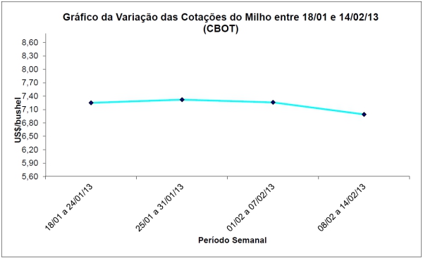 Abaixo segue o gráfico da variação de preços do milho no período de 18/01 a 14/02/2013.
