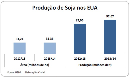 Em uma visão ainda preliminar, segundo o USDA, os produtores norte-americanos deverão cultivar 31,4 milhões de hectares de soja, o que representa um aumento de apenas 0,4% frente a área cultivada na safra 2012/13.