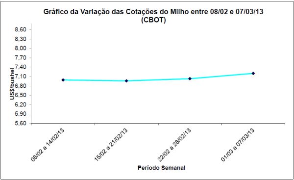 Abaixo segue o gráfico da variação de preços do milho no período de 08/02 a 07/03/2013.