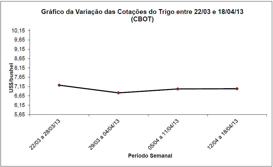 Para este 18/04 a Conab anunciava novos leilões de venda num total de 126.096 toneladas. Enquanto isso, o Brasil já teria importado mais de 300.000 toneladas de trigo dos EUA neste ano de 2013, sendo o referido volume seis vezes mais elevado do que toda a importação feita no ano passado com origem nesse país. O volume irá aumentar nas próximas semanas na medida em que a isenção da Tarifa Externa Comum do Mercosul irá até o dia 31/07. No total importado, apenas em março o Brasil adquiriu no exterior 755.200 toneladas, sendo 24.000 oriundas dos EUA e Canadá. A preocupação com a inflação está fazendo o governo brasileiro acelerar as compras externas do cereal, facilitando ao máximo as mesmas já que a Argentina tem bem menos trigo a ofertar neste ano.