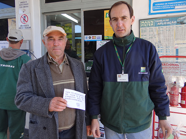 Na oportunidade, o gerente João Carlos Schossler efetuou a entrega do cheque simbólico (vale compras), para o cliente Ervino Egon Preissler.