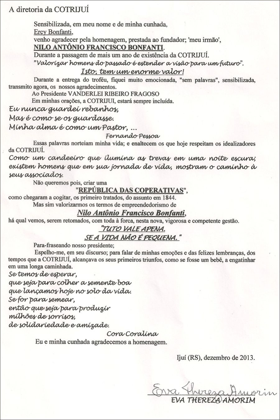 No encontro, dona Eva Amorim entregou à Direção da Cooperativa uma carta, onde agradeceu a homenagem prestada por ocasião da Expo-Ijuí-Fenadi, quando Nilo Antônio Francisco Bonfanti foi destacado com o Troféu 56 anos, na categoria Personalidade Cooperativista. Após receber a carta da família Amorim, a Direção da Cotrijui decidiu dividir essa bela mensagem com os milhares de associados.