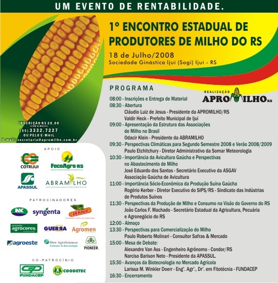 A APROMILHO preparou um grande evento no qual serão apresentadas e discutidas com mesa de debates, informações sobre perspectivas de produção e consumo do milho, avanços da biotecnologia no mercado agrícola, perspectivas da avicultura e suinocultura gaúcha, além das perspectivas climáticas para o segundo semestre de 2008 e verão 2008/2009.