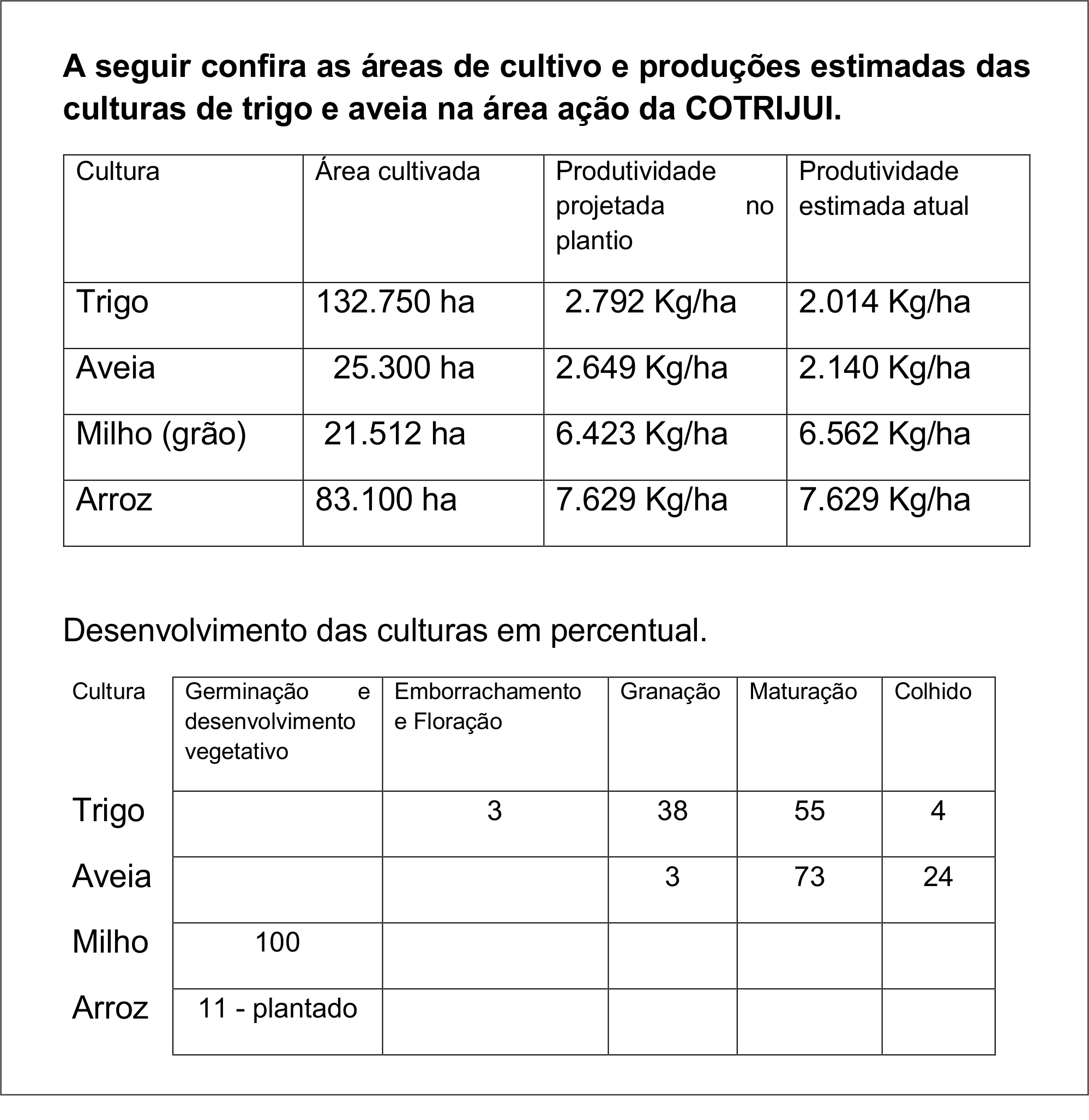 Como de hábito, o Departamento Agrotécnico da Cotrijui divulga amplo relatório sobre a situação das lavouras de inverno na área de atuação da Cooperativa. Confira os dados: