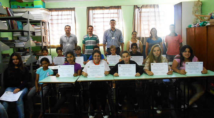 Cotrijui e Syngenta prosseguem nas etapas conclusivas do Projeto Escola no Campo. Mais uma fase teve a solenidade de encerramento realizada na semana passada (dia 27 de Novembro quinta-feira), ensejando a participação de inúmeros estudantes do Ensino Fundamental. O trabalho teve lugar no Município de Chiapetta na região Celeiro, contemplando um grupo de estudantes da Escola Haideê Chiapetta, localizada no Assentamento Nova Conquista. Na oportunidade além de troca de informações, e apresentação de trabalhos afins, também houve a entrega de Certificados aos alunos concluintes. Cotrijui e Syngenta foram representados pelo Diretor de Produção Agropecuária da Cooperativa, Engenheiro Agronômo, Nelson Smola, Gerente das Unidades de Santo Augusto e Chiapetta, Eder Cronst e pelo Engenheiro Agronômo com atuação em Chiapetta, Diovani Antonow.