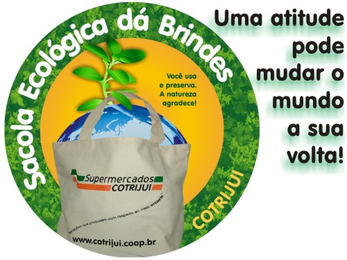 Lançada no último dia 4 de fevereiro do corrente ano, a Campanha da Sacola Ecológica visa criar um mutirão de preservação da natureza através de uma simples atitude: o uso da sacola retornável. Para isso, os Supermercados COTRIJUI elaboraram uma promoção de incentivo aos seus clientes: a cada compra realizada nos Supermercados COTRIJUI utilizando uma sacola retornável de qualquer tipo, o cliente receberá selos valendo pontos. A medida que acumular estes pontos, poderá trocá-los por brindes como: bombas de chimarrão, camisetas, garrafas térmicas, sacolas térmicas, cadeiras de varanda e cestas com produtos das marcas TCHÊ, COOPER e LEVIESTI. A cada troca dos pontos por brindes, o cliente ainda recebe cupons para concorrer a prêmios como: furadeiras, home theater, máquina de lavar roupas, máquina fotográfica digital, forno microondas, etc. A campanha será lançada em toda a rede de Supermercados COTRIJUI em 3 fases distintas, sendo que os pontos não serão cumulativos de uma fase para a outra. A troca de pontos por brindes e os sorteios serão localizados em cada uma das lojas da rede de Supermercados da COTRIJUI.