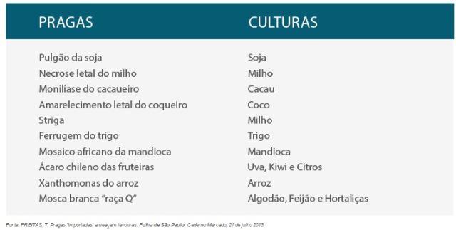 Um estudo divulgado pela Embrapa levantou os pontos mais suscetíveis ao ingresso de pragas agropecuárias ausentes no Brasil. Conhecidas como quarentenárias, essas pragas ameaçam à economia agrícola. Com isso, evitar sua chegada ou controlar a proliferação é fundamental para o setor. O trânsito de navios, aviões, trens, carros ou caminhões; produtos de origem animal ou vegetal, pessoas e até mesmo correntes de vento podem ser vetores dessas pragas.