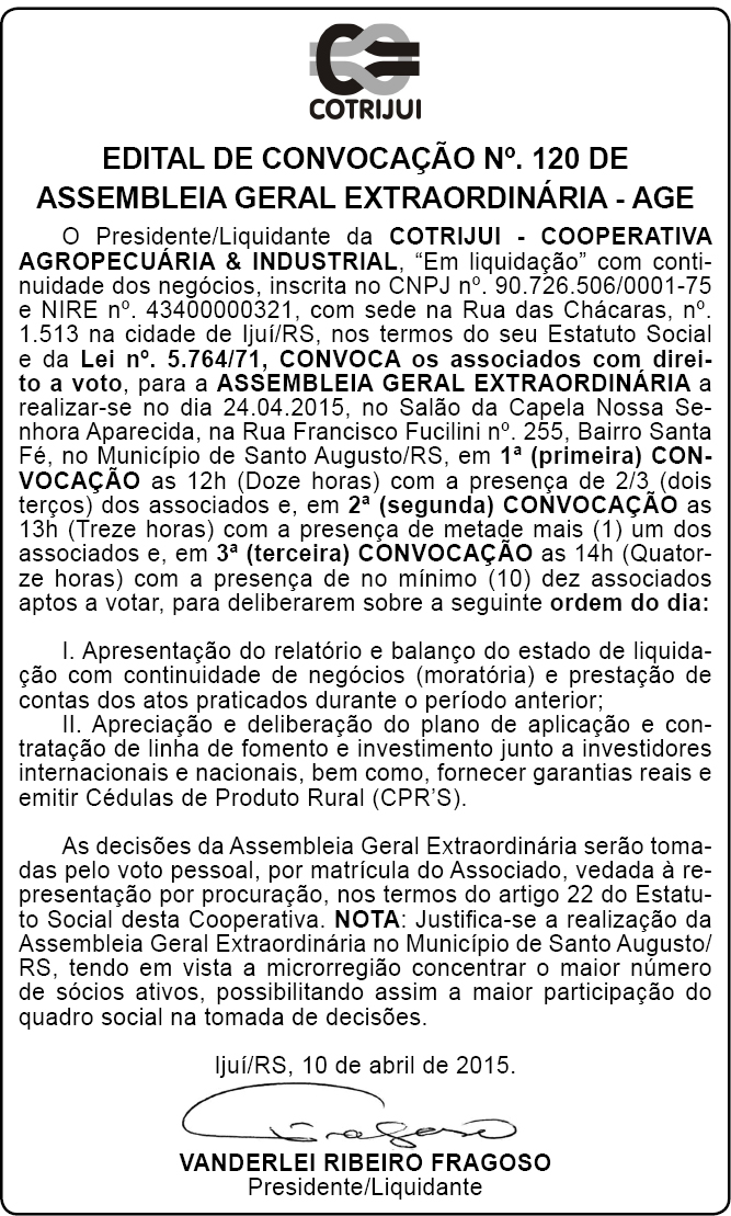 Confirmando o que já era previsto, o Presidente da Cotrijui, Vanderlei Ribeiro Fragoso, decidiu convocar Assembléia Geral com fim específico. O encontro, com primeira chamada às 12:00, segunda às 13:00 e terceira e última às 14:00hs terá lugar no Município de Santo Augusto (RS). A seguir confira o edital na íntegra: