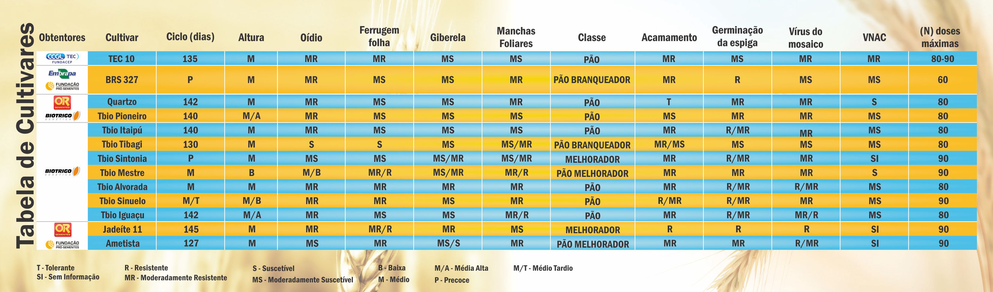 Confira a seguir as variedades de sementes que a COTRIJUI comercializa aos associados e demais clientes, sendo que todas tem capacidade genética para produzir TRIGO pão ou melhorador, produtos que tem facilidade no mercado, tanto que nesta semana o governo federal confirmou o preço mínimo ao produto em R$ 34,98 a saca de 60 quilos (clique na imagem para ampliar):