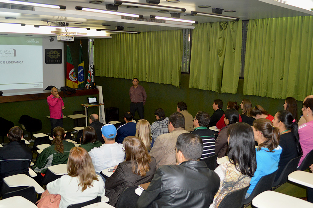 Em seguida, um grupo de aproximadamente 50 profissionais está participando de conferência com o tema Gestão de Lideranças, tendo como palestrante o especialista na área Antonio Kobes.