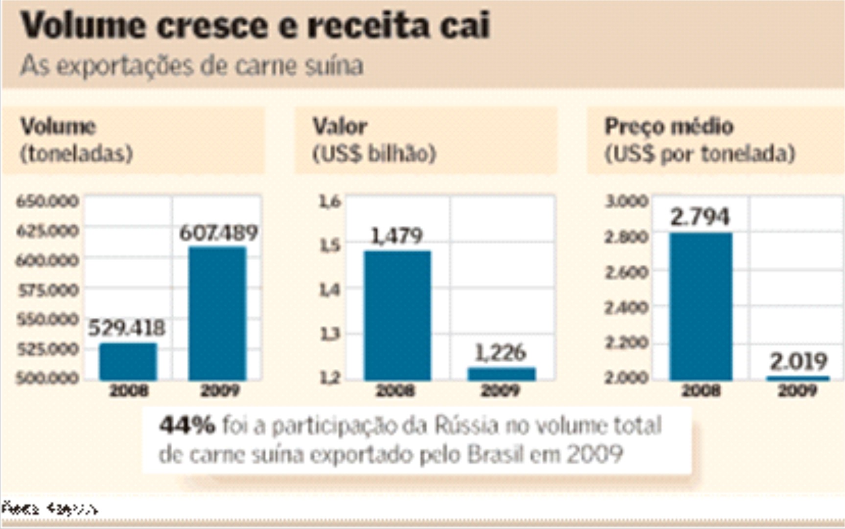 Segundo ele, a nova cota da Rússia para a carne suína "melhora um pouco" a situação do Brasil. Em dezembro, o governo russo publicou as novas cotas para a importação de carnes e elevou de 177.500 toneladas em 2009 para 189.600 toneladas este ano a cota destinada a "outros países", na qual o Brasil se insere.