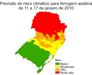 No PR o risco climático foi diferenciado entre as regiões onde o maior risco ocorreu no norte do estado nas últimas semanas. Já no RS, as chuvas abundantes se concentraram na região central do estado no mesmo período. O prognóstico para a região Sul indica alto risco de condições climáticas favoráveis à ferrugem em todas as regiões do PR e SC. No RS, as condições irão variar de moderado a alto risco no norte do Estado, enquanto que é prevista condição desfavorável no sudoeste e noroeste.