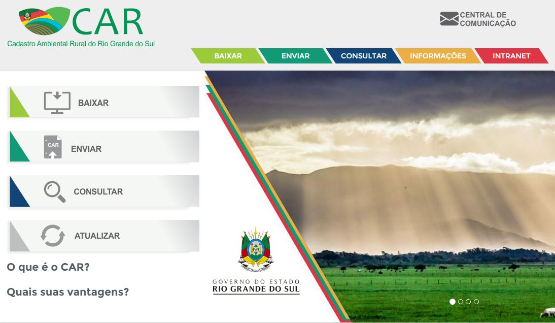 A versão gaúcha do Cadastro Ambiental Rural (CAR/RS) já está disponível online. O envio das informações pode ser realizado apenas pelo site. O endereço está adaptado à legislação do estado do Rio Grande do Sul, principalmente em relação ao Bioma Pampa e banhados.