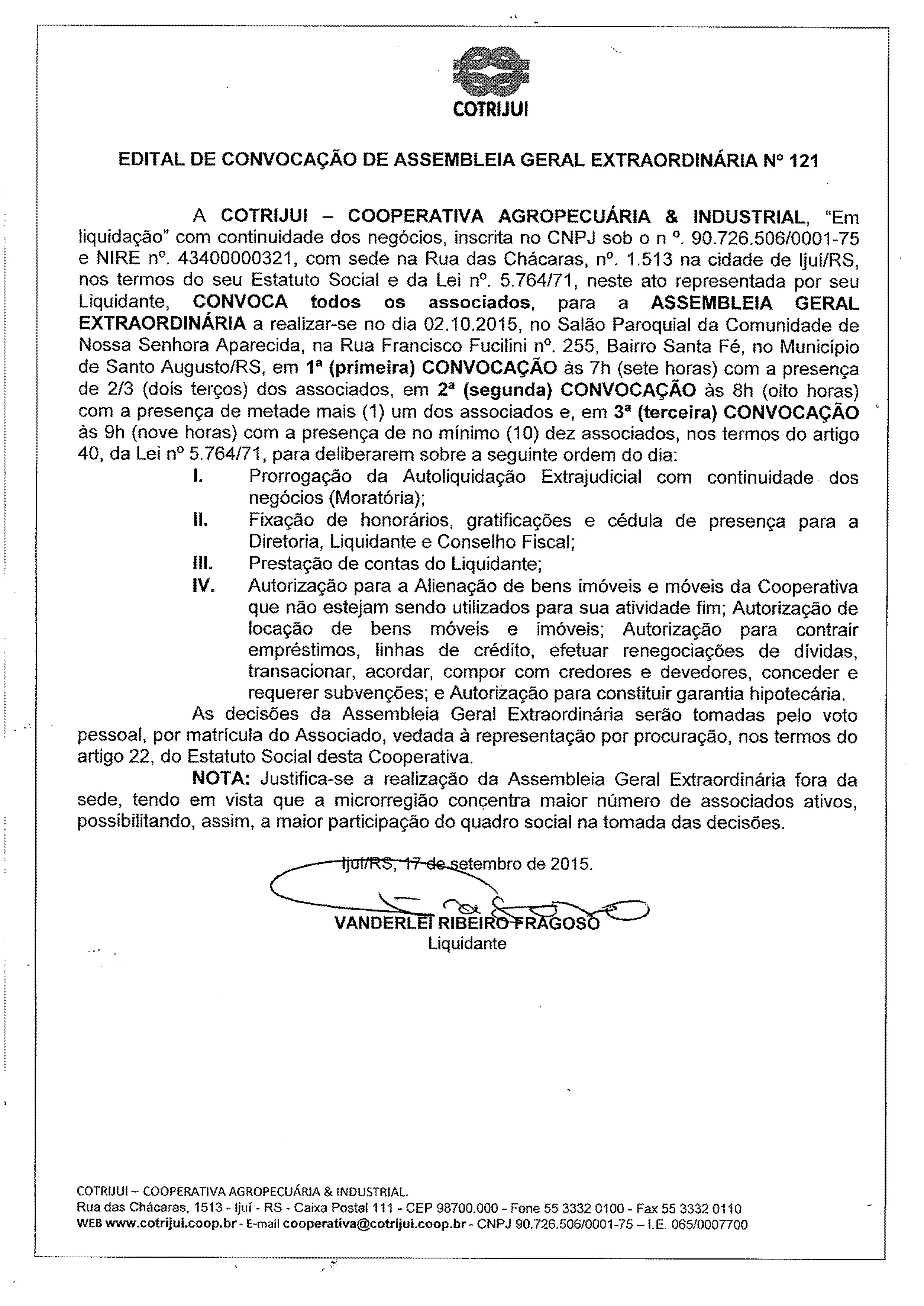 A Cotrijui - Cooperativa Agropecuária e Industrial, "Em liquidação" com continuidade dos negócios, convoca todos os associados para Assembleia Geral Extraordinária, a realizar-se no dia 02 de outubro de 2015, no Salão Paroquial da Comunidade de Nossa Senhora Aparecida, na Rua Francisco Fucilini nº 255, bairro Santa Fé, no município de Santo Augusto, em primeira convocação às 7 horas com a presença de 2/3 dos associados, em segunda convocação às 8 horas com a presença de metade mais (1) dos associados e, em terceira convocação às 9 horas com a presença de no mínimo (10) dez associados. Leia o Edital na íntegra abaixo: