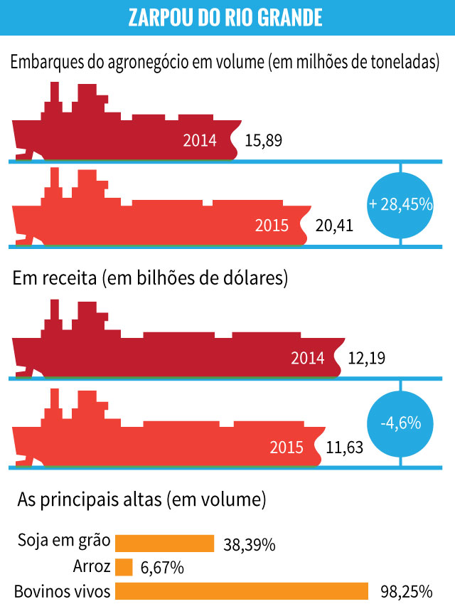 Puxando os embarques, itens esperados, como a soja, e gratas surpresas, como o arroz, que depois de um primeiro trimestre difícil, fechou o ano-calendário com quantidade 6,67% maior exportada. Nesse caso, reflexo da melhora nos valores no mercado internacional e da competitividade ganha lá fora pelo produto brasileiro com a alta do dólar.