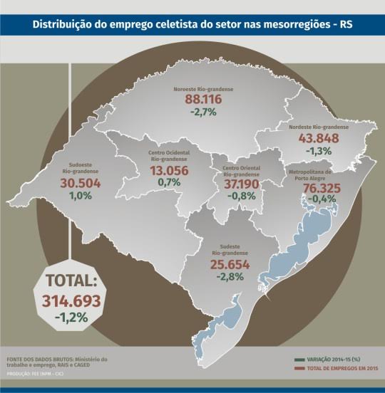 Em termos regionais, a distribuição do emprego é desigual e reflete a especialização produtiva do território gaúcho. A mesorregião Noroeste é a que concentra a maior parte dos empregos do setor (28,%), seguida da Metropolitana de Porto Alegre (24,3%).