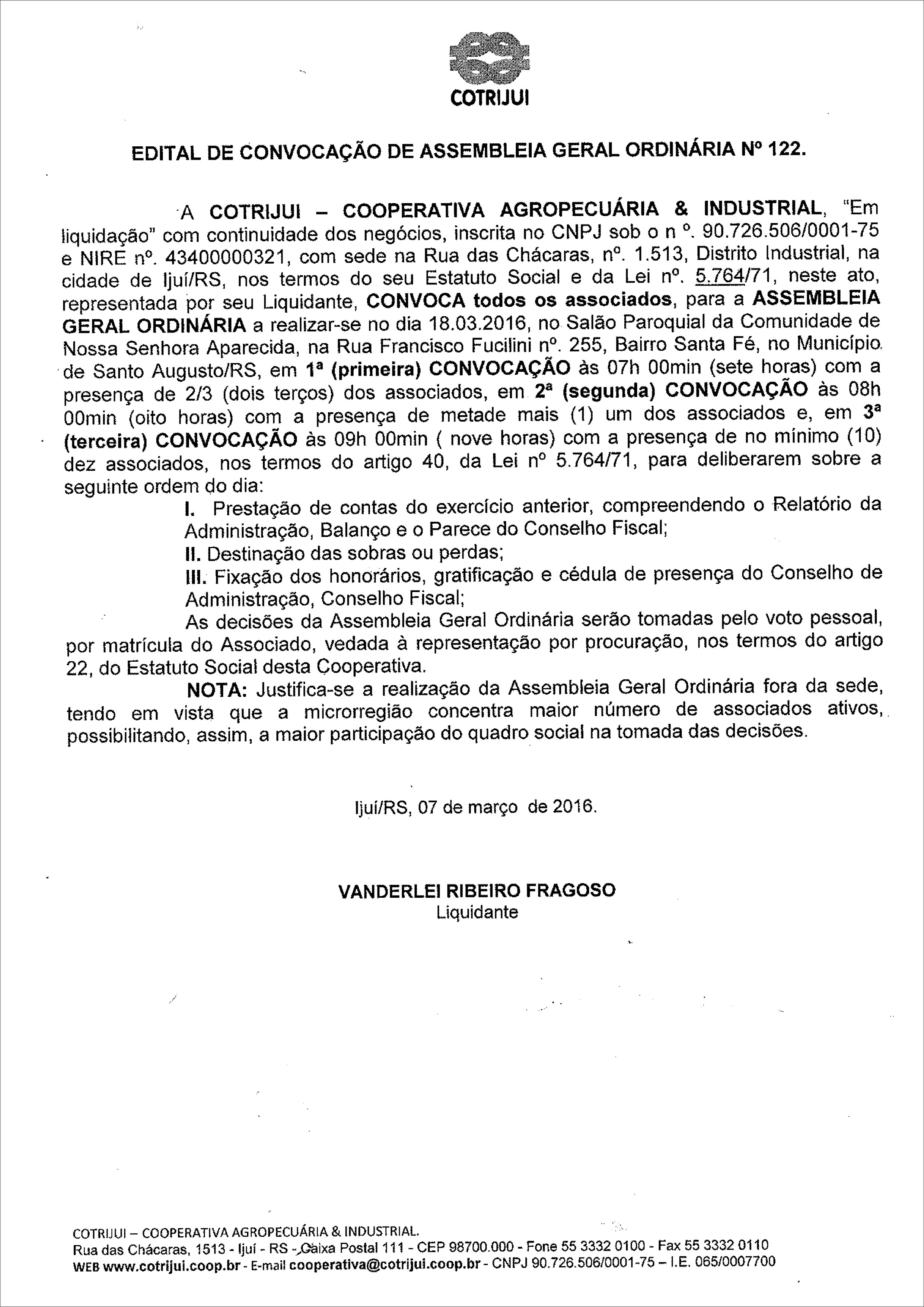 A Cotrijui - Cooperativa Agropecuária e Industrial, "Em liquidação" com continuidade dos negócios, convoca todos os associados para Assembleia Geral Ordinária, a realizar-se no dia 18 de março de 2016, no Salão Paroquial da Comunidade de Nossa Senhora Aparecida, na Rua Francisco Fucilini nº 255, bairro Santa Fé, no município de Santo Augusto/RS, em primeira convocação às 7 horas com a presença de 2/3 dos associados, em segunda convocação às 8 horas com a presença de metade mais (1) dos associados e, em terceira convocação às 9 horas com a presença de no mínimo (10) dez associados. Leia o Edital na íntegra abaixo:
