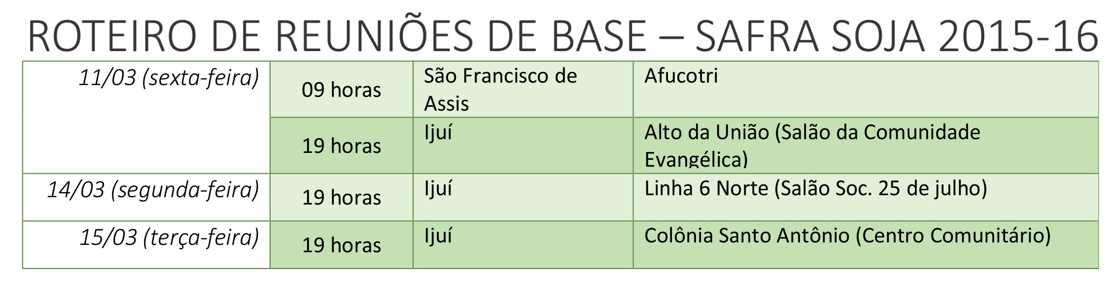 Hoje, haverá reunião na Afucotri de São Francisco de Assis, às 9 horas e, à noite, a diretoria retorna para Ijuí e realiza o encontro na comunidade de Alto da União, às 19 horas.