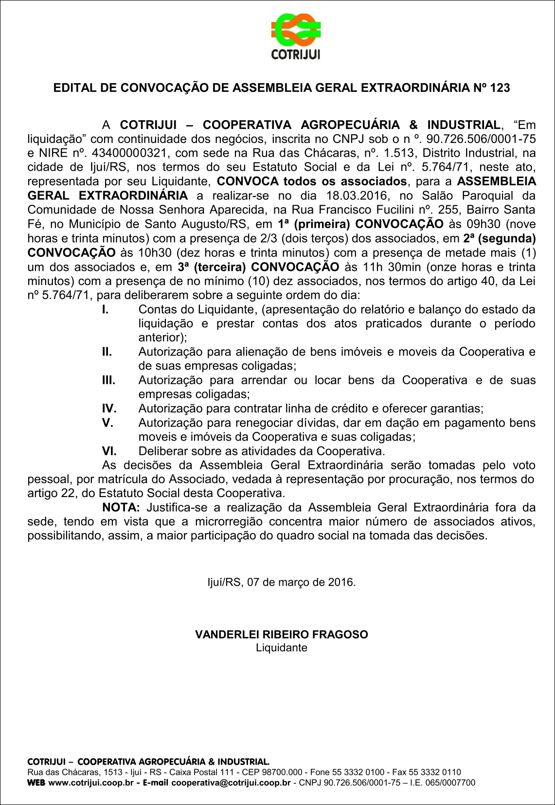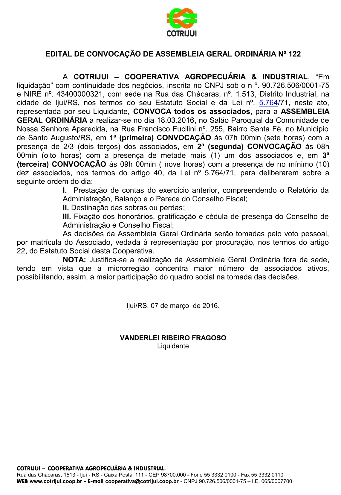 A Cotrijui convida todo o seu quadro social para participar da Assembleia Geral Ordinária e Extraordinária da próxima sexta-feira, 18, que acontecerá no município de Santo Augusto. O evento será realizado no salão paroquial da comunidade de Nossa Senhora Aparecida, na Rua Francisco Fucilini nº 255, bairro Santa Fé. A primeira chamada será às 07 horas, a segunda às 08 horas e a terceira e última chamada às 09 horas.