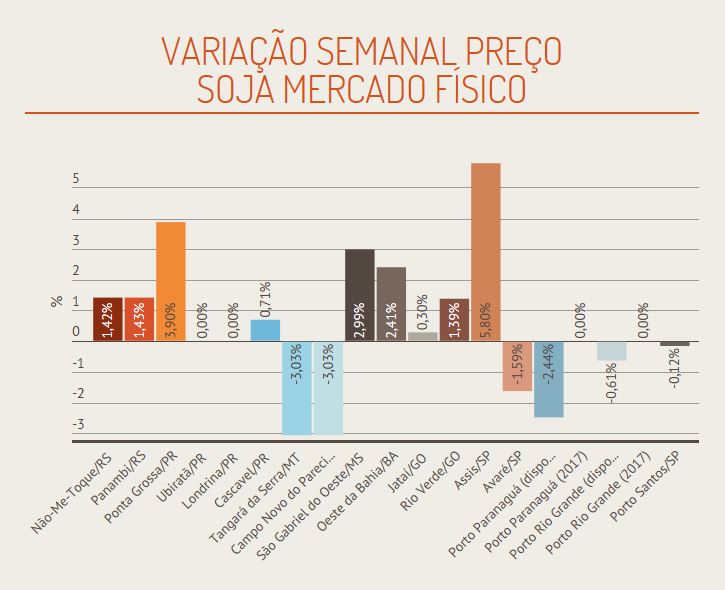 A movimentação da comercialização não foi tão intensa como a da última semana, mas segue registrando um ritmo melhor do que vinha sendo observado há alguns meses. Estimativas não oficiais indicam que o Brasil já conta com, aproximadamente, pouco mais de 40% da safra 2016/17 comercializada.