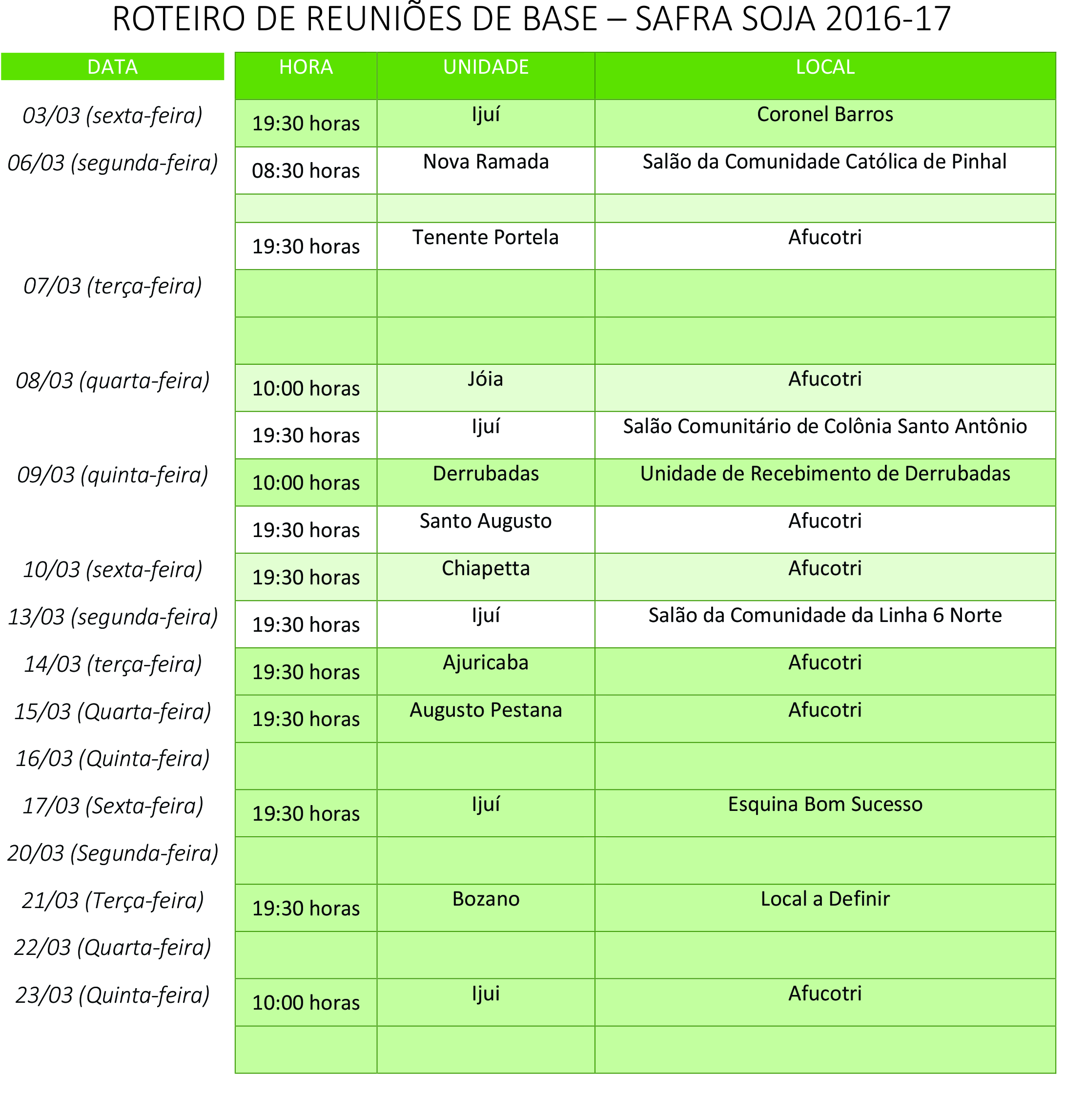 Conforme o cronograma de Reuniões de Base que teve início no dia 21 de fevereiro, a direção da Cotrijui vem realizando diversas reuniões com seus associados.