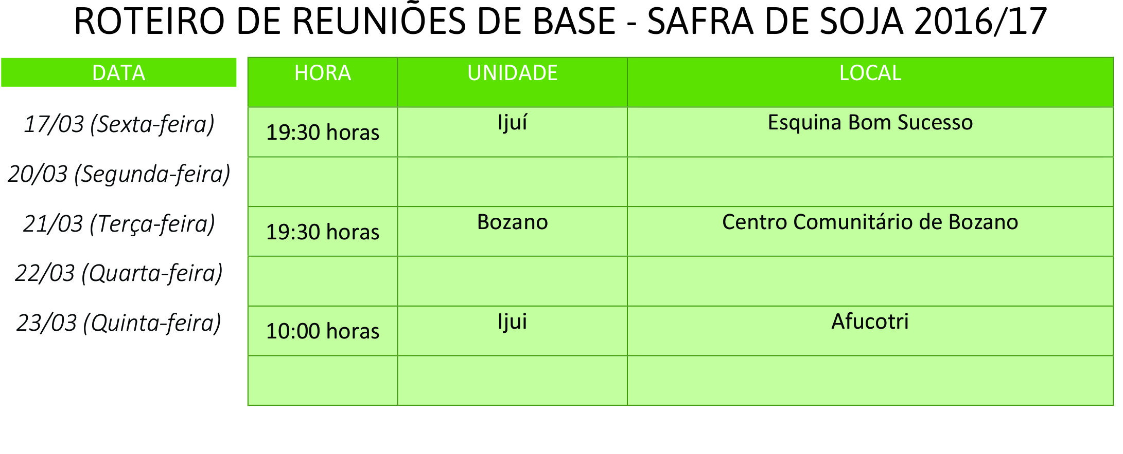 A exemplo de reuniões que já aconteceram em Dom Pedrito, Unistalda, Manoel Viana, São Francisco de Assis, Santiago, Coronel Barros, Nova Ramada, Tenente Portela, Jóia, Derrubadas, Santo Augusto, Chiapetta, Ajuricaba, e Augusto Pestana prosseguem no dia de hoje, 17, pra encerrar esta semana, que contou com reuniões nas unidades de Ijuí, Ajuricaba e Augusto Pestana, reunião de base em Esquina Bom Sucesso, abordado diversos assuntos de interesse dos produtores associados, como o relatório de atividades, recebimento e armazenamento da safra de soja e outros assuntos de interesse do quadro social.