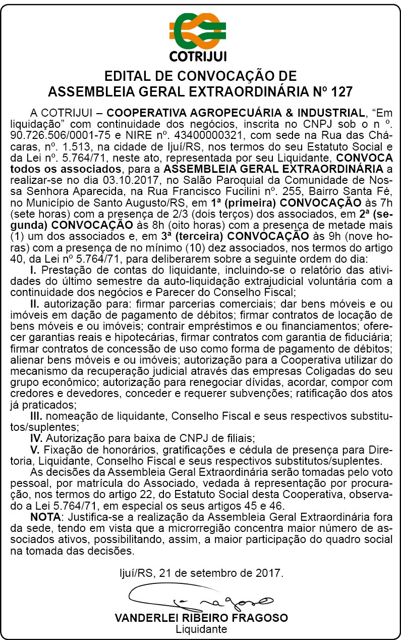 A Cotrijui - Cooperativa Agropecuária e Industrial, "Em liquidação" com continuidade dos negócios, convoca todos os associados para Assembleia Geral Extraordinária, a realizar-se no dia 03 de outubro de 2017, no Salão Paroquial da Comunidade de Nossa Senhora Aparecida, na Rua Francisco Fucilini nº 255, bairro Santa Fé, no município de Santo Augusto, em primeira convocação às 7 horas com a presença de 2/3 dos associados, em segunda convocação às 8 horas com a presença de metade mais (1) dos associados e, em terceira convocação às 9 horas com a presença de no mínimo (10) dez associados.