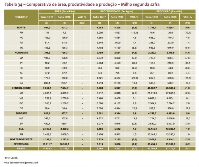 Na safrinha de 2018, a área semeada com o milho deverá ficar próxima da registrada no ciclo anterior, apesar do atraso observado no plantio da soja da safra 2017/18. Na safra passada, em torno de 12 milhões de hectares foram cultivados com o grão. E até o momento, as consultorias privadas estimam a segunda safra entre 63 milhões até 65,6 milhões de toneladas, uma queda de até 6,5% em relação ao colhido no ano anterior, de 67,38 milhões de toneladas.