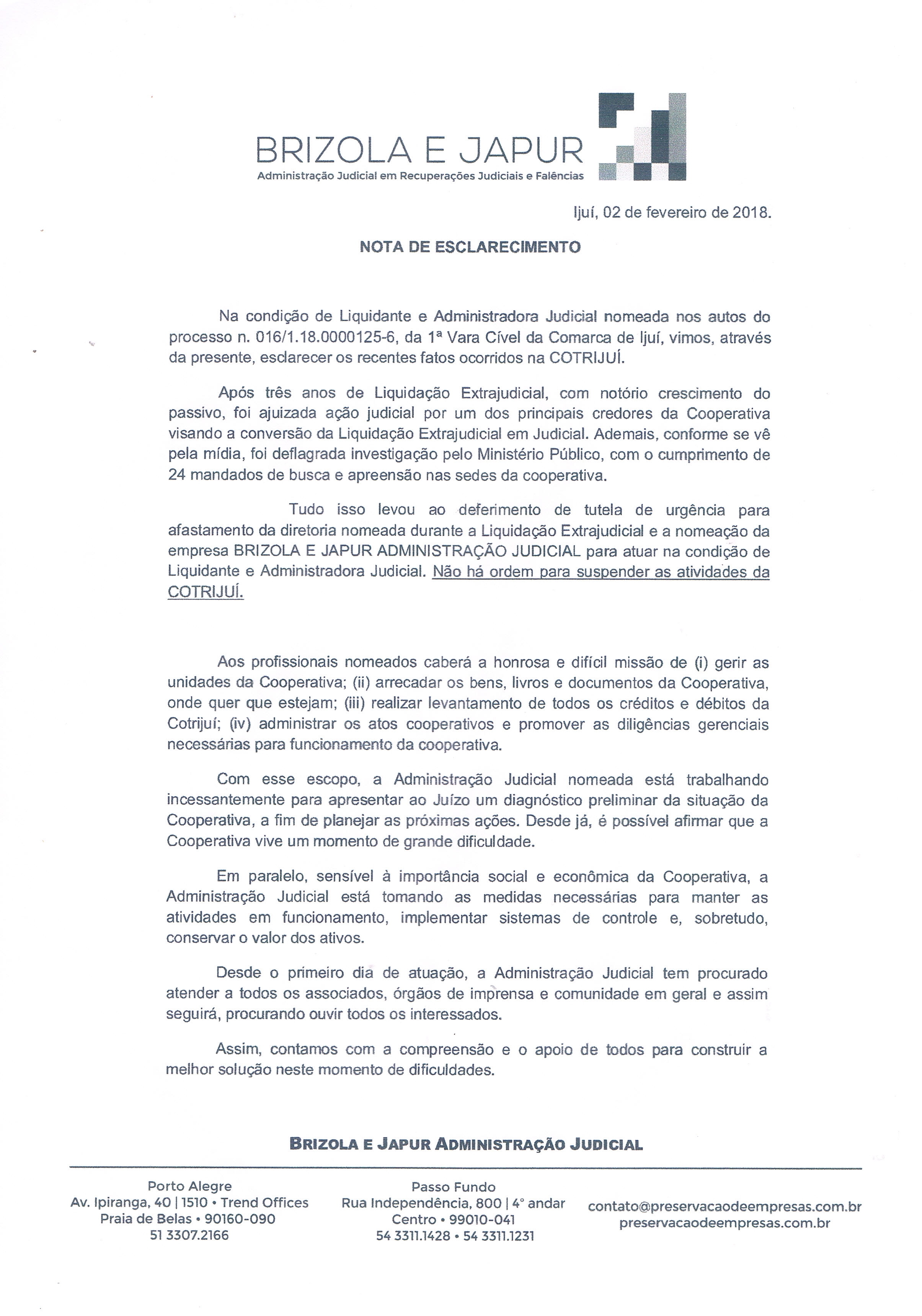 Nota de Esclarecimento Judicial - COTRIJUI 02/02/2018