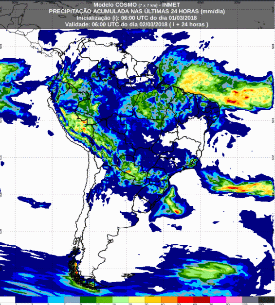 Veja no mapa ao lado a previsão de precipitação acumulada para até 72 horas (02/03 a 04/03) para todo o Brasil: