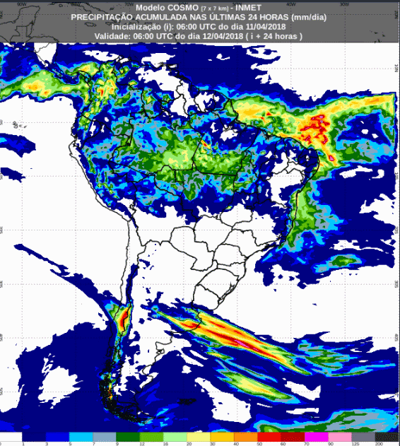 O modelo Cosmo do Inmet (Instituto Nacional de Meteorologia) mostra que instabilidades passam a atuar sobre o Sul do país a partir desta quinta-feira (12), mas as precipitações ainda ficam mais localizadas sobre o estado do Rio Grande do Sul. Apenas no início da próxima semana é que elas e espelham por toda a região.