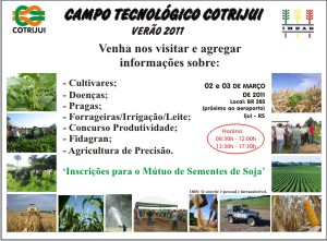 A COTRIJUI estará repassando informações e orientações dos experimentos relacionados com as culturas de verão aos seus associados durante o Campo Tecnológico que acontecerá nos dias 02 e 03 de março de 2011, na área experimental localizada na BR 285, próximo ao aeroporto de Ijuí.