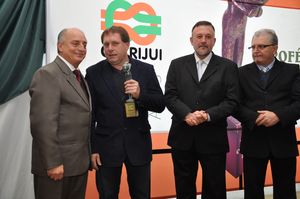Categoria Personalidade Cooperativista – Giovani Cherini, Deputado Ferderal, educador, cooperativista e profundo conhecedor do sistema, Presidente da FRENCOOP – Frente Parlamentar do Cooperativismo na Câmara dos Deputados, repete em seu primeiro mandato o que sempre priorizou nos quatro mandatos de Deputado Estadual: a defesa do cooperativismo e da produção com sustentabilidade. O homenageado foi representado pelo Vereador Valmir Chico Seifert, que recebeu o Troféu COTRIJUI.