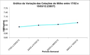 As cotações do milho em Chicago, ao contrário da soja, variaram muito pouco neste mês de março. O fechamento neste dia 15/03 (quinta-feira) ficou em US$ 6,69/bushel (primeiro mês cotado passou a ser maio/12), contra US$ 6,53 no primeiro dia de março e US$ 6,40/bushel na média de fevereiro passado. Isso confirma que, passado o anúncio do relatório de intenção de plantio nos EUA, previsto para o dia 30/03, é possível que tenhamos um ajuste para baixo nas cotações da soja (salvo se o relatório reduzir em muito a área a ser semeada com a oleaginosa).