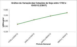 Desta forma, o fechamento deste dia 15/03 ficou em US$ 13,69/bushel (o primeiro mês cotado passou a ser maio/12), após US$ 13,16 no primeiro dia do mês de março e US$ 12,58/bushel na média de fevereiro passado. Ou seja, os preços atuais já ultrapassam em mais de um dólar o valor da média do mês passado.