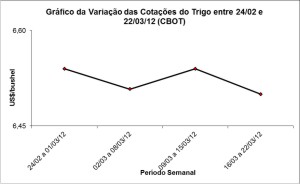 As cotações do trigo em Chicago pouco evoluíram durante a semana, fechando o dia 22/03 em US$ 6,46/bushel, contra US$ 6,72 no dia 16/03.