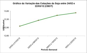 As cotações da soja em Chicago sofreram uma pequena freada durante a semana, em função de correção técnica (venda por parte dos operadores, após as constantes altas) ocorrida no início da mesma. O fechamento desta quinta-feira (22) ficou em US$ 13,49/bushel, após US$ 13,74 no dia 16/03 (a mais alta cotação neste ano). Isso dito, a tendência de alta permanece, pelo menos até o dia 30/03, quando sai o relatório de intenção de plantio e dos estoques trimestrais nos EUA.