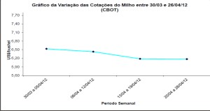 Acima o gráfico da variação de preços do milho no período de 30/03 a 26/04/2012.