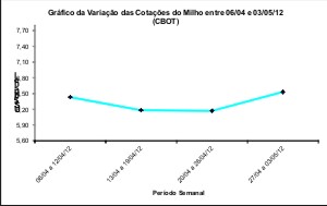 Acima o gráfico da variação de preços do milho no período de 30/03 a 26/04/2012.