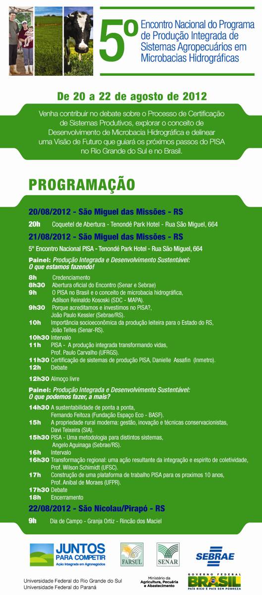 O Programa Juntos Para Competir (FARSUL/SENAR/SEBRAE) convida a todos para participar do 5° Encontro Nacional do Programa PISA que acontecerá a partir do dia 20/08/2012 no Hotel Tenondé em São Miguel das Missões, conforme programação abaixo: