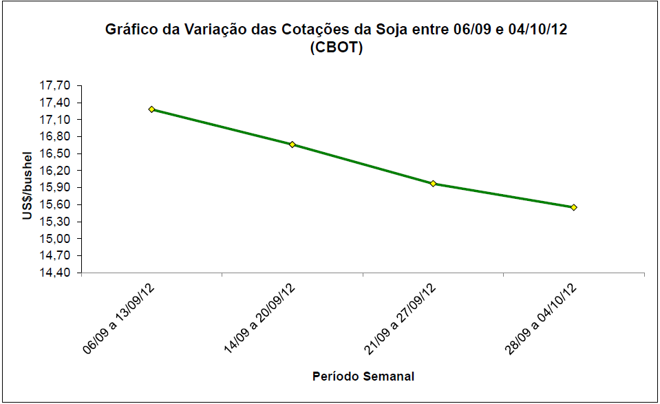 Acima o gráfico da variação de preços da soja e seus derivados no período de 06/09 a 04/10/2012.