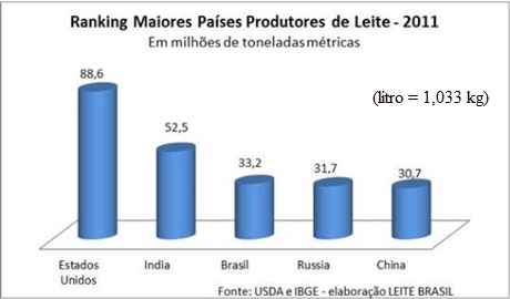 Com base nos dados do Departamento de Agricultura dos Estados Unidos, divulgados em julho deste ano, o resultado da Pesquisa da Pecuária Municipal coloca o Brasil na terceira posição no ranking dos maiores produtores de leite do mundo, com produção equivalente a 33,2 milhões de toneladas métricas*, aproximadamente.