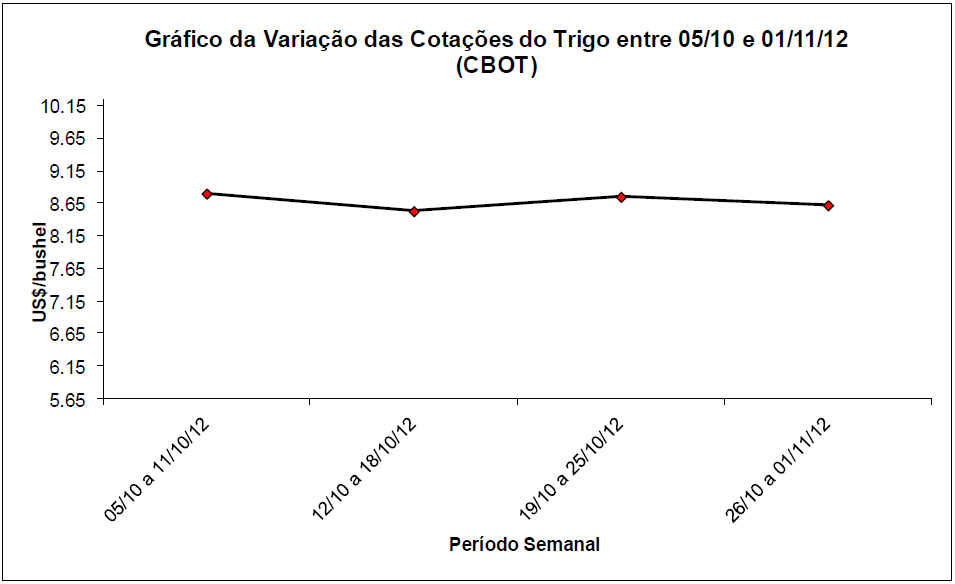 Acima o gráfico da variação de preços do trigo no período entre 05/10 e 01/11/2012.