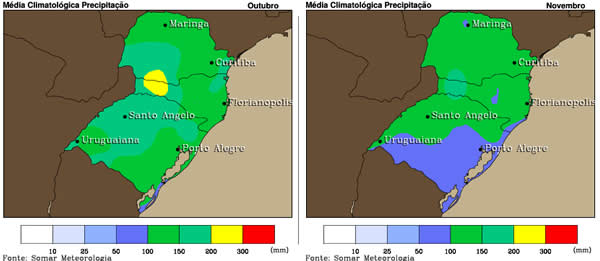 Diferentemente do registrado em outubro, novembro será caracterizado pela diminuição da intensidade e frequência de chuva. Tanto que, de acordo com a simulação americana CCM3, esperam-se acumulados abaixo da média no Paraná, boa parte de Santa Catarina e no norte do Rio Grande do Sul.